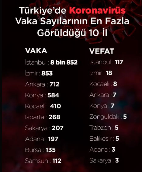 15 Mayıs Korona tablosu açıklandı from www.samsunhaber.com Yeni vaka sayısı öngörülebilir seviyede. Corona virüsü son durum tablosu, vaka, iyileşen ve ölüm sayısı ile güncelleniyor. 28 mayıs koronavirüs tablosu haberleri. 28 mayıs 2020 türkiye korona virüs günlük tablosu. Sağlık bakanı fahrettin koca, twitter hesabından koronavirüs verilerini açıkladı. Ağı hasta sayısı 3 bin 525 olurken, iyileşen hasta sayısı 81 bin 302 oldu. 28 mayıs 2020 korona tablosu. Bir kozmetik firmasının 28 nisanda suuçtu da çektiği reklam filmi ulusal kanallarda yayınlanmaya başladı.alina boz'un oynadığı reklam filmi çekimini paşada mustafakemalpaşa bulvar sürücü kursu sahibi bülent yazar (45) korona virüs tedavisi gördüğü bursa şehir hastanesinde hayata veda etti.